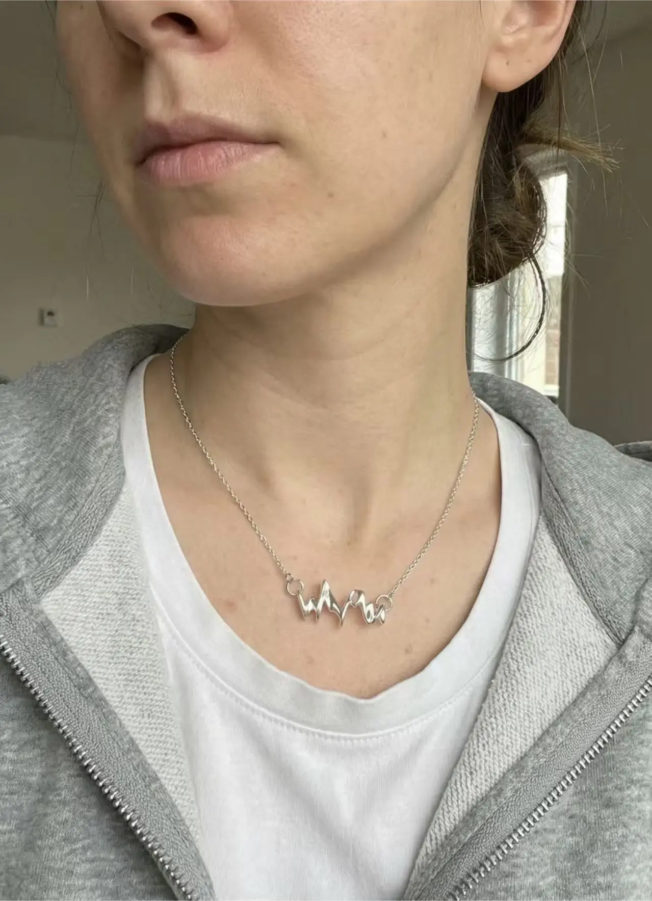 The sound-wave design makes the necklace feel modern and meaningful. I was worried it might look plain, but it stands out in a classy way. I wear it almost every day.