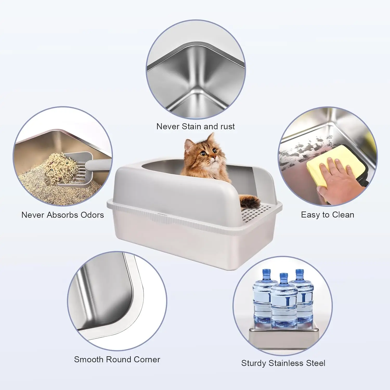 EASY TO CLEAN & WASH – Durable stainless steel ensures a hygienic environment, reducing odors effectively, cat litter pan can stay cleaner for longer. There is no need for scrubbing and scraping stubborn spots. Just easily wipe the bottom with a damp cloth or towel